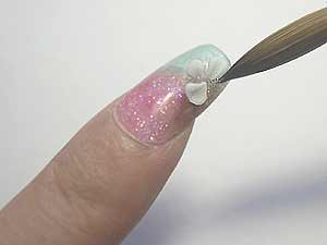 清除餘粉後, 沾取白色水晶粉製作小花.
