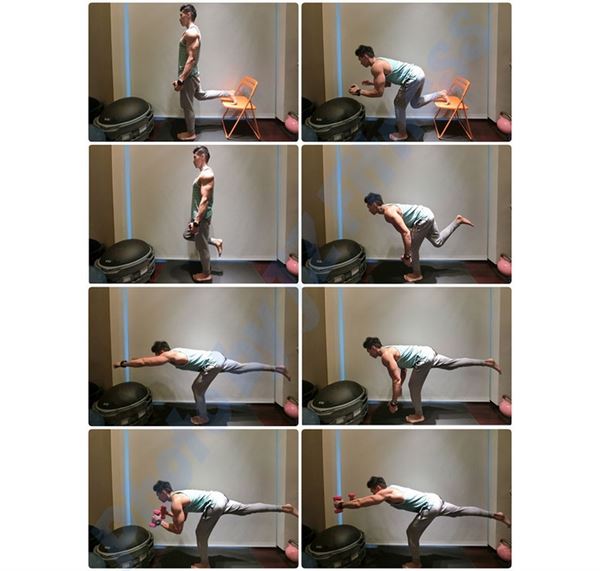 從雙腳改單腳是增加難度及負荷卻又不增加重量的好方法。單腳動作與雙腳相同,而單腳需要較好的平衡穩定性,也需要較多力量,可以單腳放在椅子上熟悉動作,待能力提升後,可嘗試不依靠椅子甚至做出更多變化以及加上些許重量。