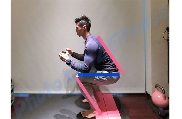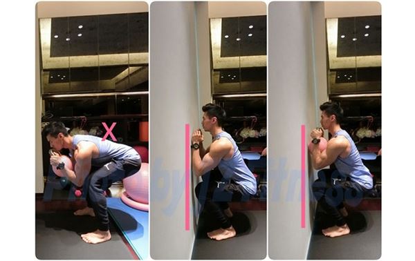 負重在前面可以幫助身體不過度前倒,因為有重量在前面,身體比較容易自然胸口挺直,也可以在靠近牆面做練習,為了避免撞牆,身體比較容易呈現正確姿勢蹲下。